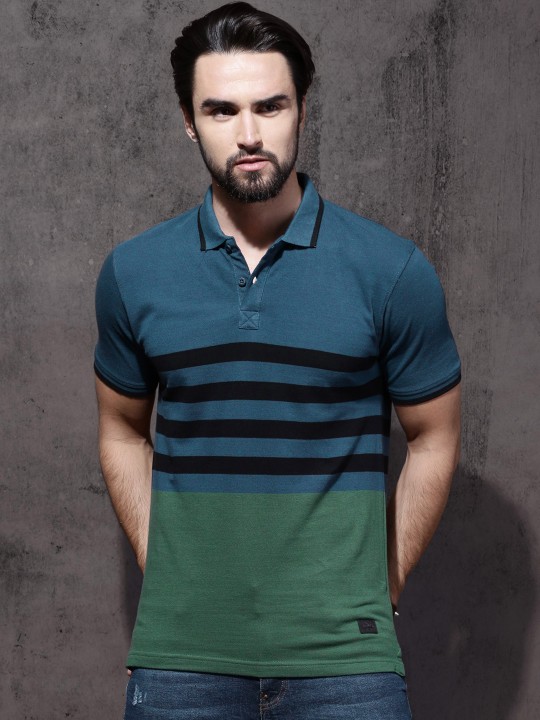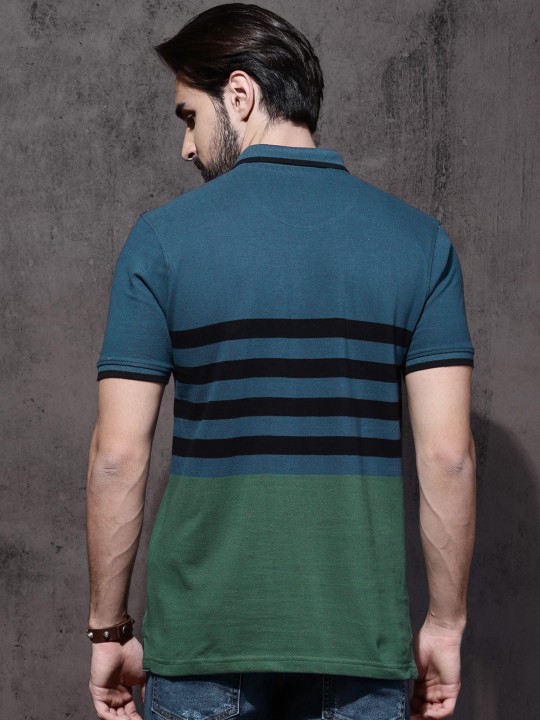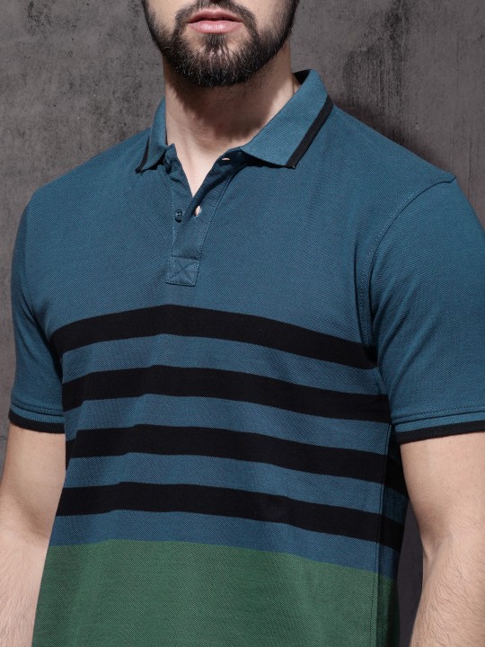 Product Name: Roadster Men Blue & Green Striped Polo Collar Pure Cotton T-shirt