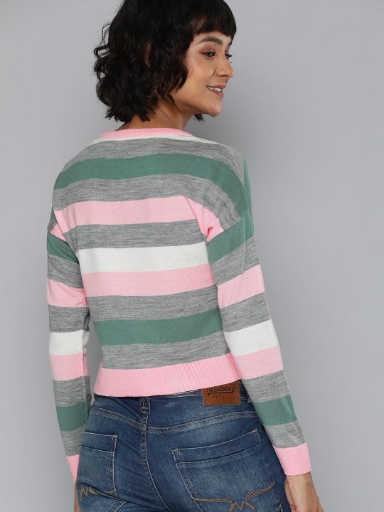Grey and Pink striped cropped pullover sweater, has a round neck, long drop-shoulder sleeves, and ribbed hem