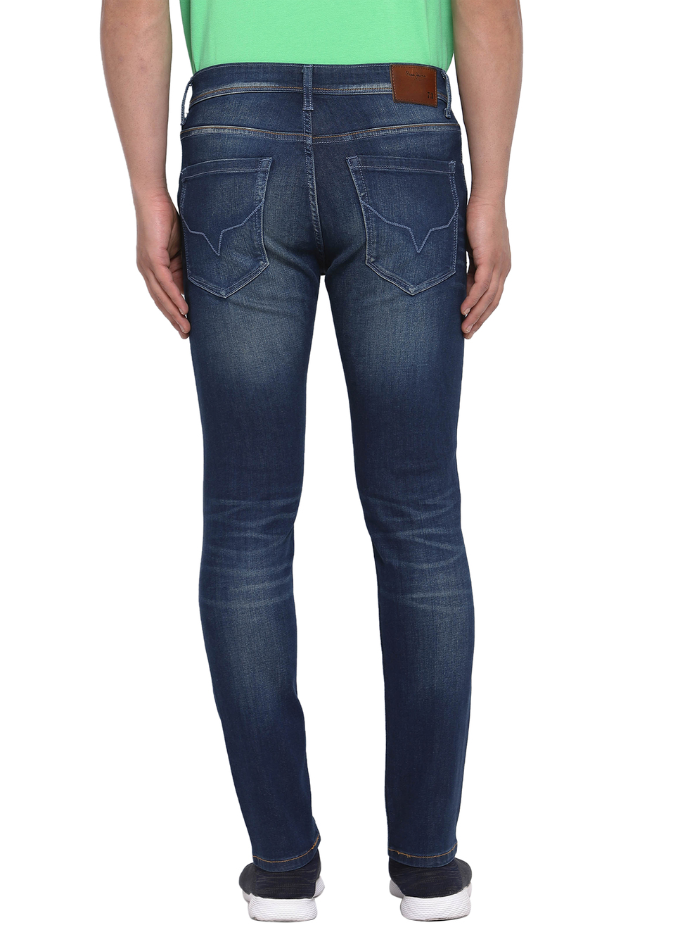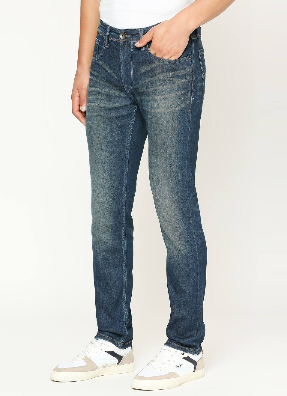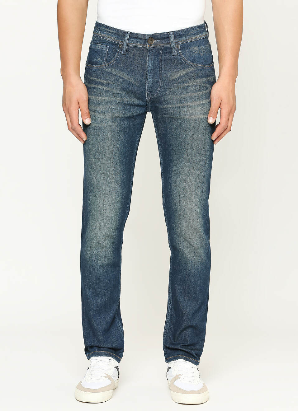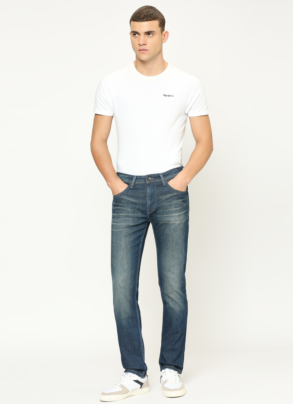 Basic 5 Pocket Tapered Fit- Low Rise Jeans, Dark Blue- Lightly Faded With A Classic Clean Look