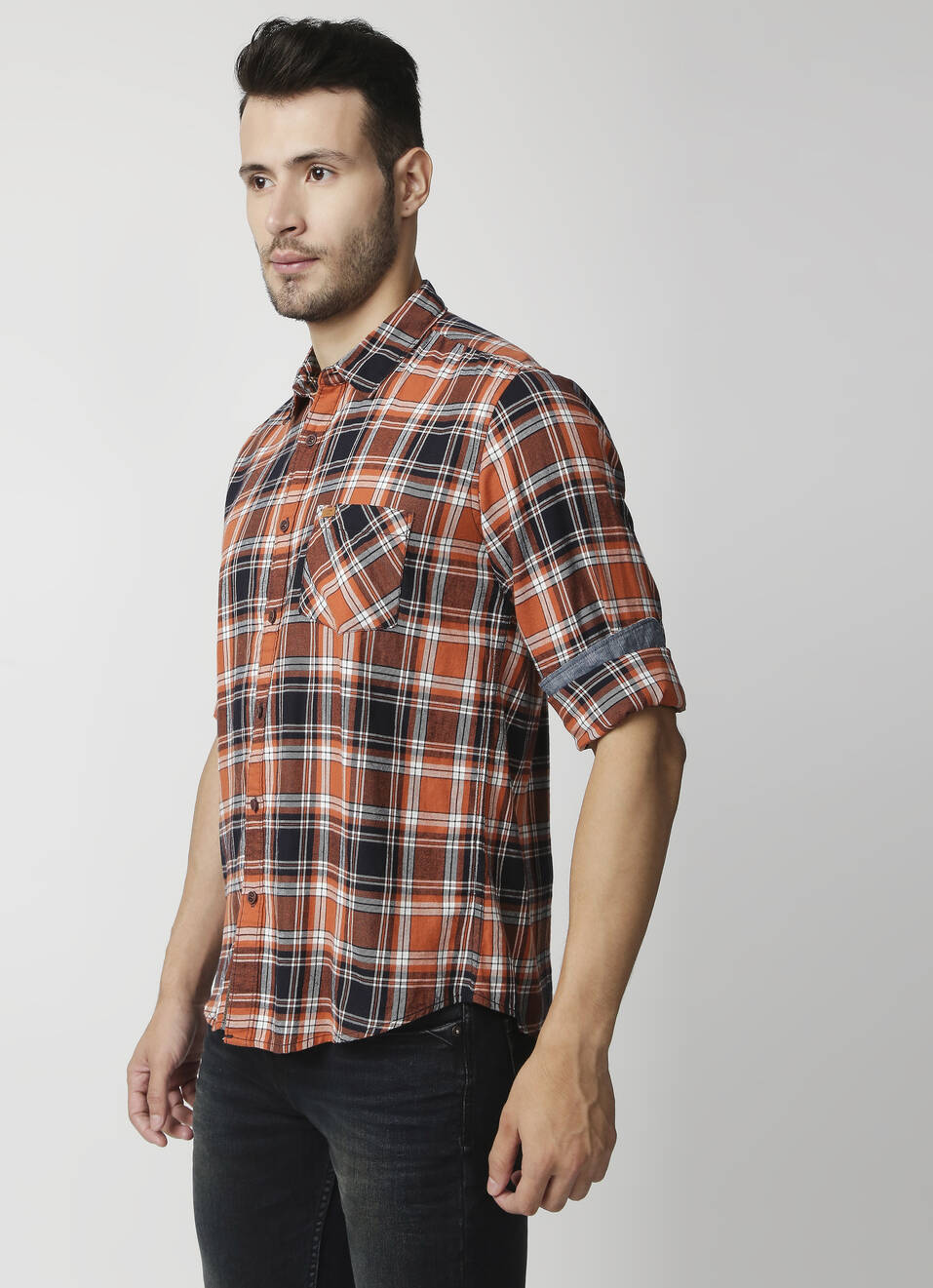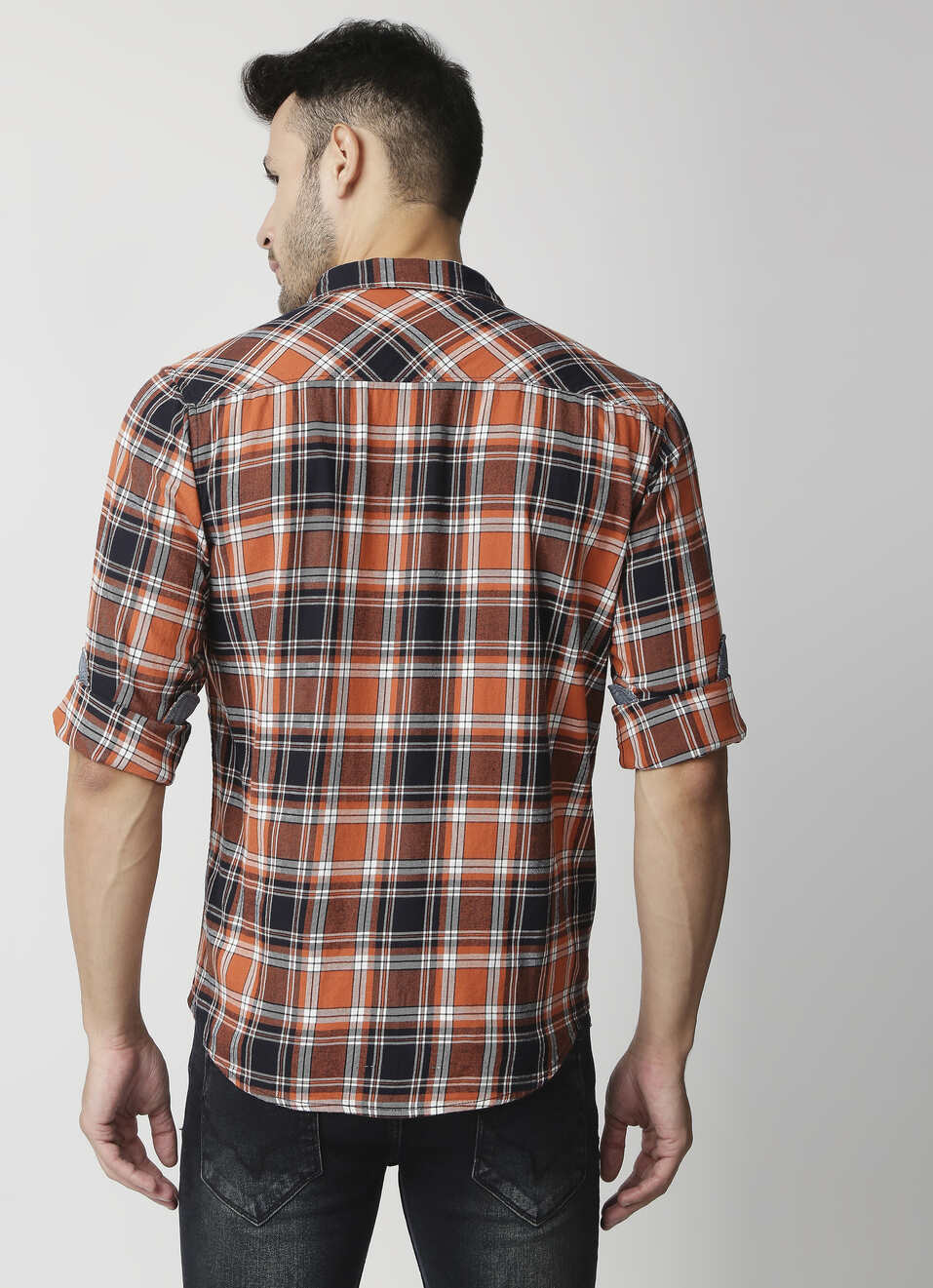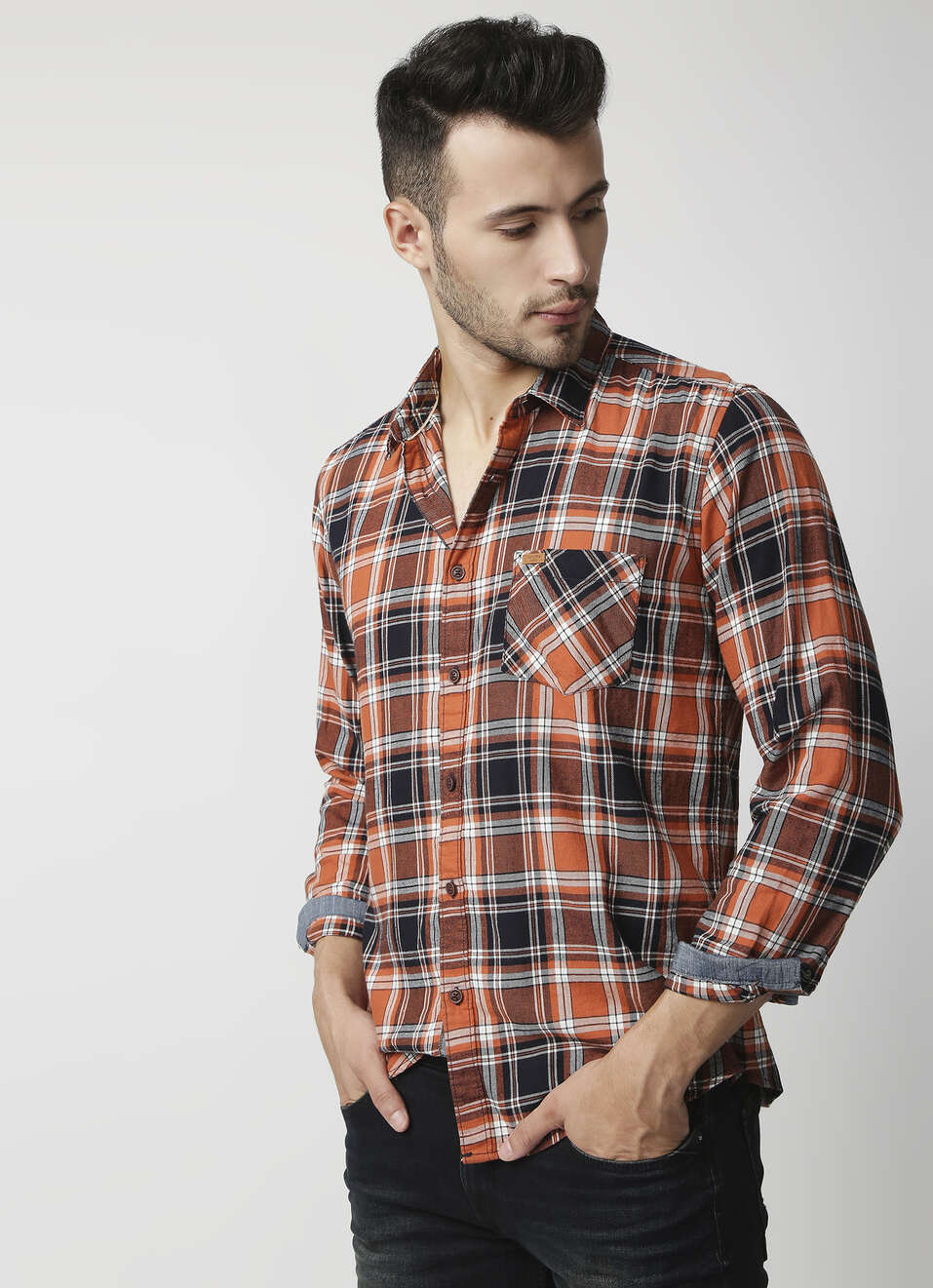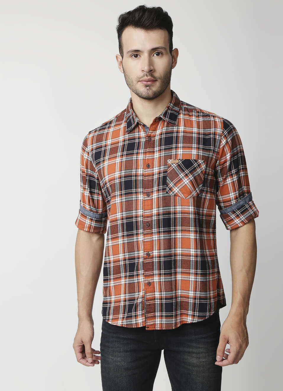 Add an interesting twist to your casual wardrobe with this orange checked shirt. The perfect combination of comfort and style featuring full sleeves and a front pocket with Pepe branding. Made from 100% cotton for the comfort you seek. Wear it with your distressed jeans and canvas shoes to create a trendy look. Buy online now!